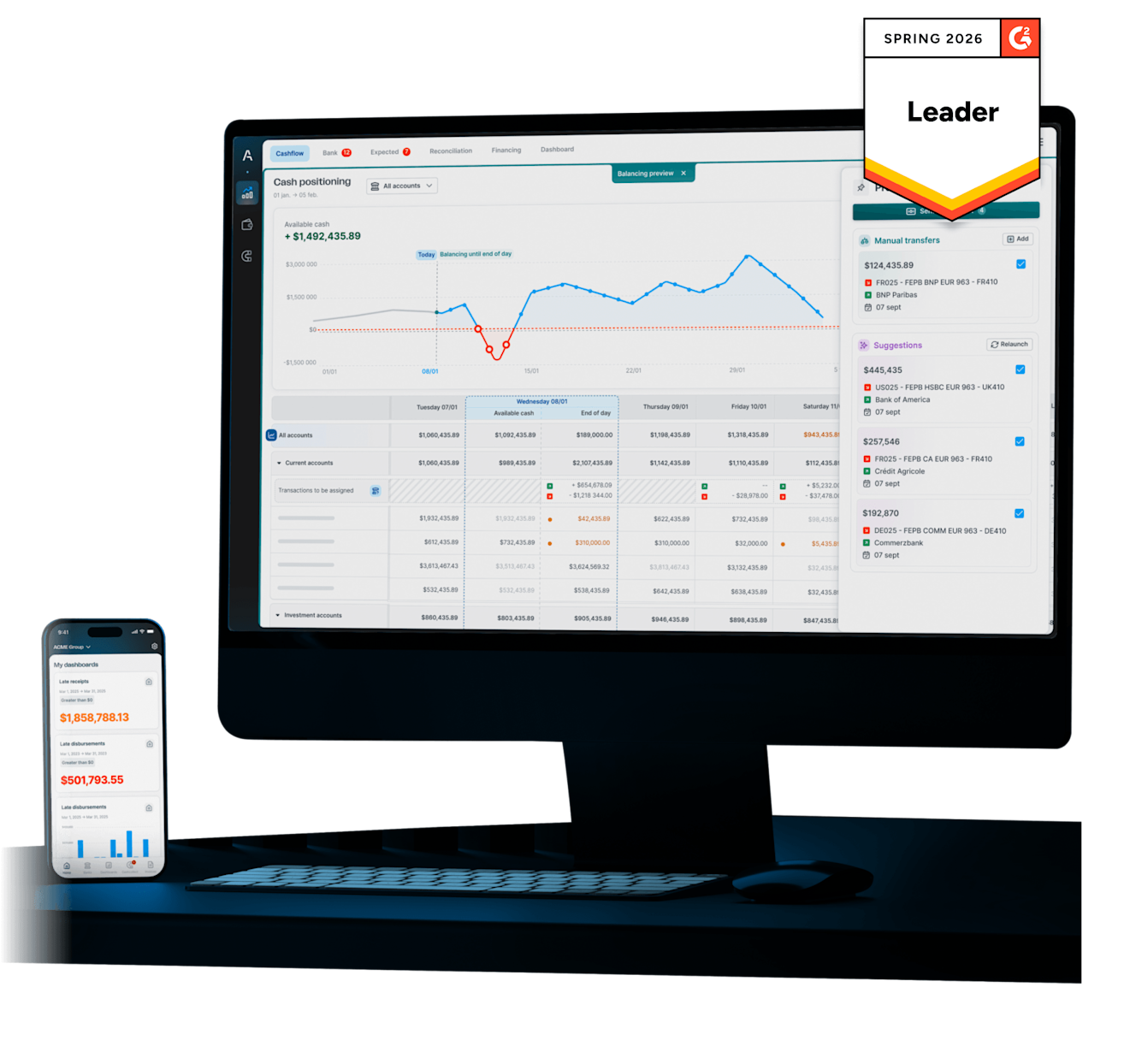 The AI-powered platform connecting your banking and accounting flows to unlock trapped liquidity. Cash management, cash forecasting, payments and transfers, collections, and bank reconciliation. All on one platform.