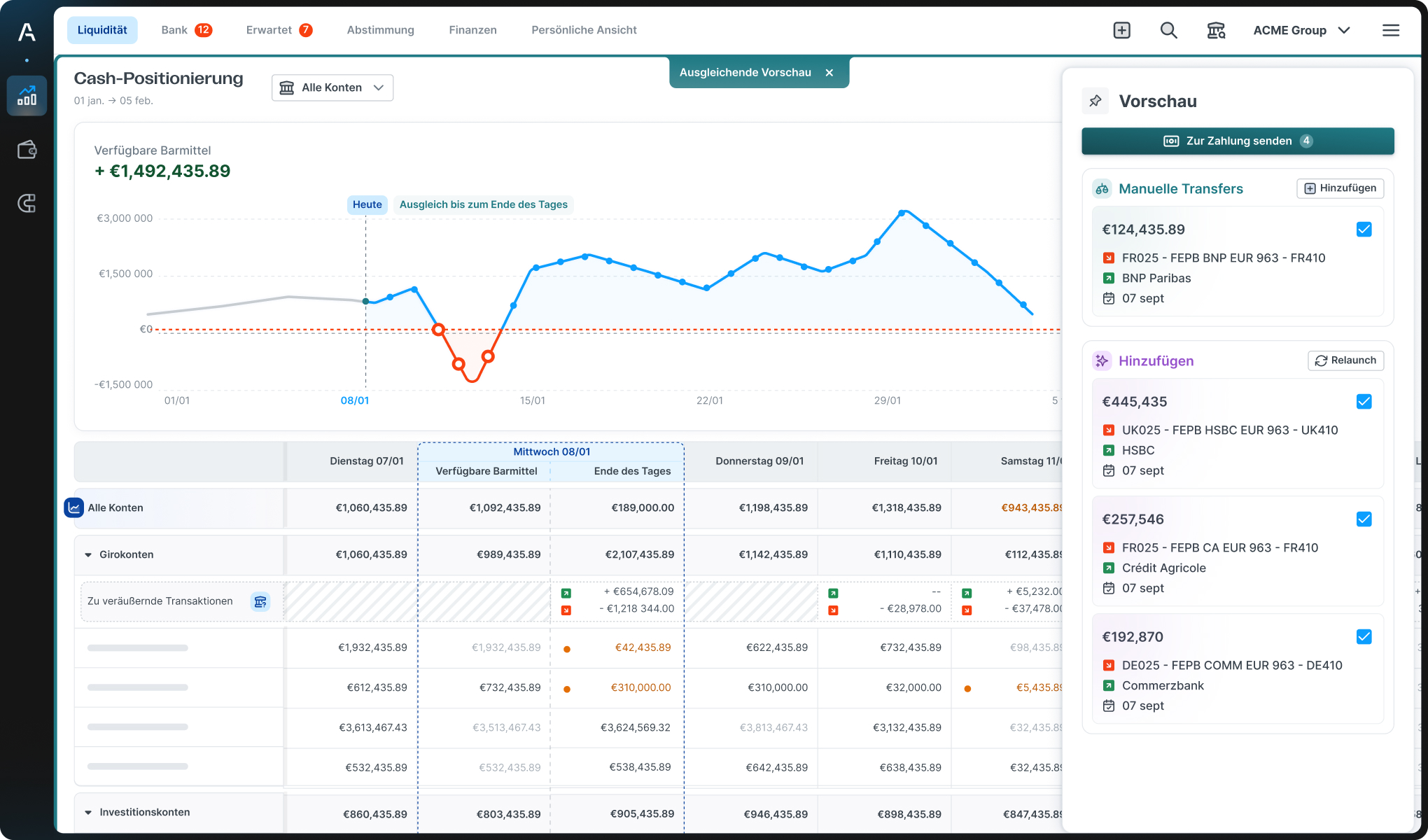 Konsolidierte Echtzeit-Transparenz über alle Bankkonten und Gesellschaften (inkl. Multi-Bank, Multi-Entity & Multi-Währung): Alle Konten, Standorte und Währungen zentral und tagesaktuell im Blick – für maximale Transparenz und sofortige Steuerbarkeit der Liquidität.