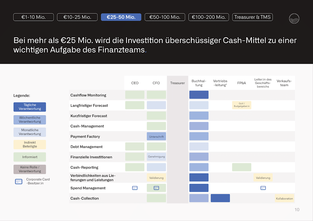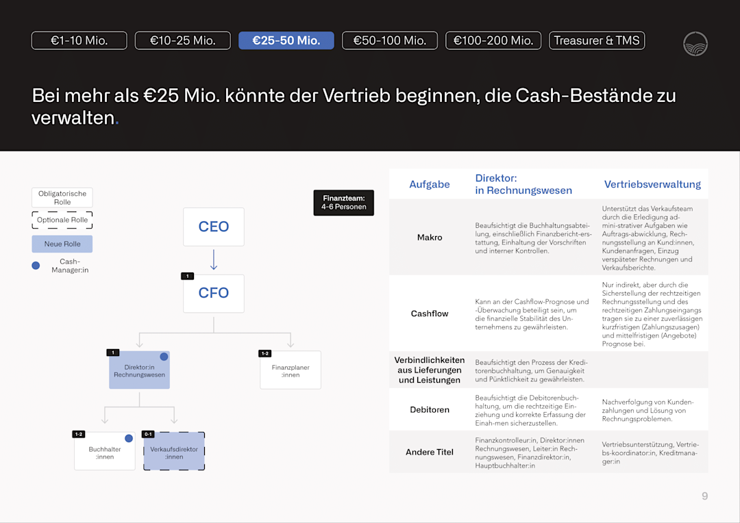 Wir skizzieren außerdem die neuen Rollen, die mit dem Unternehmenswachstum eingeführt werden, und spezifizieren deren Stellenbeschreibungen, vor allem für Positionen im Bereich des Liquiditätsmanagements (z. B. Treasurer, der typischerweise ab einem Umsatz von 50 Millionen Euro hinzugefügt wird). Jede Beschreibung hebt die wichtigsten Verantwortlichkeiten und alternative Bezeichnungen für diese Rollen hervor.