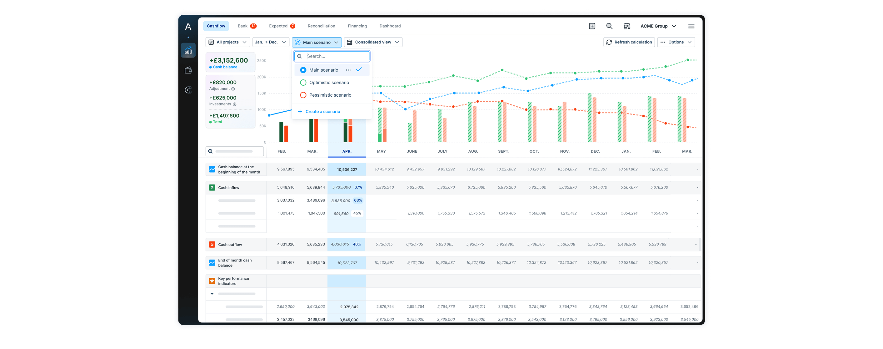 Anticipate cash flow shortages beforehand, craft scenarios that are based on actual financial data, extend ERP-systems with cash flow management capabilities