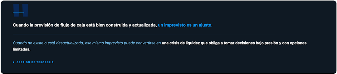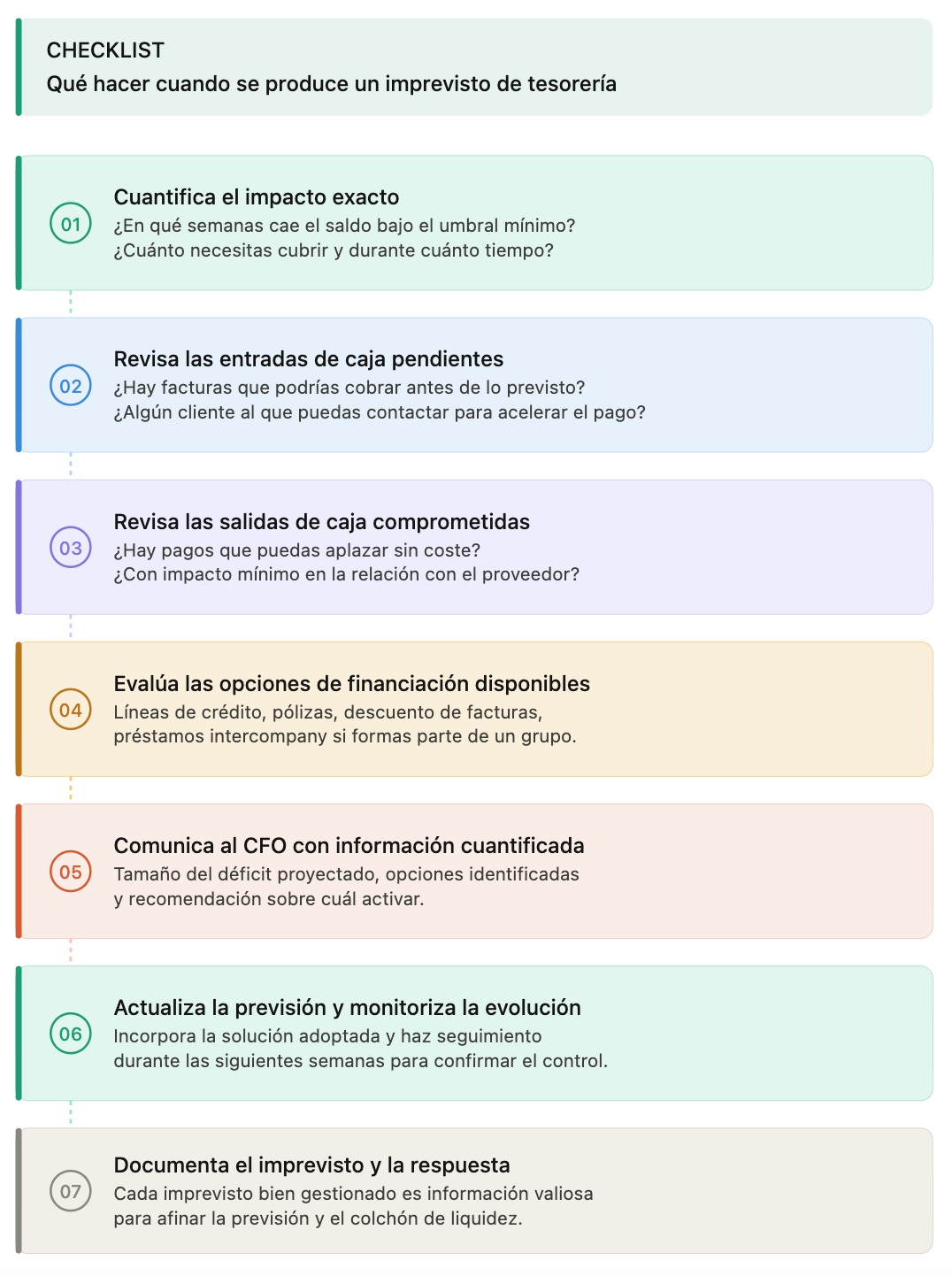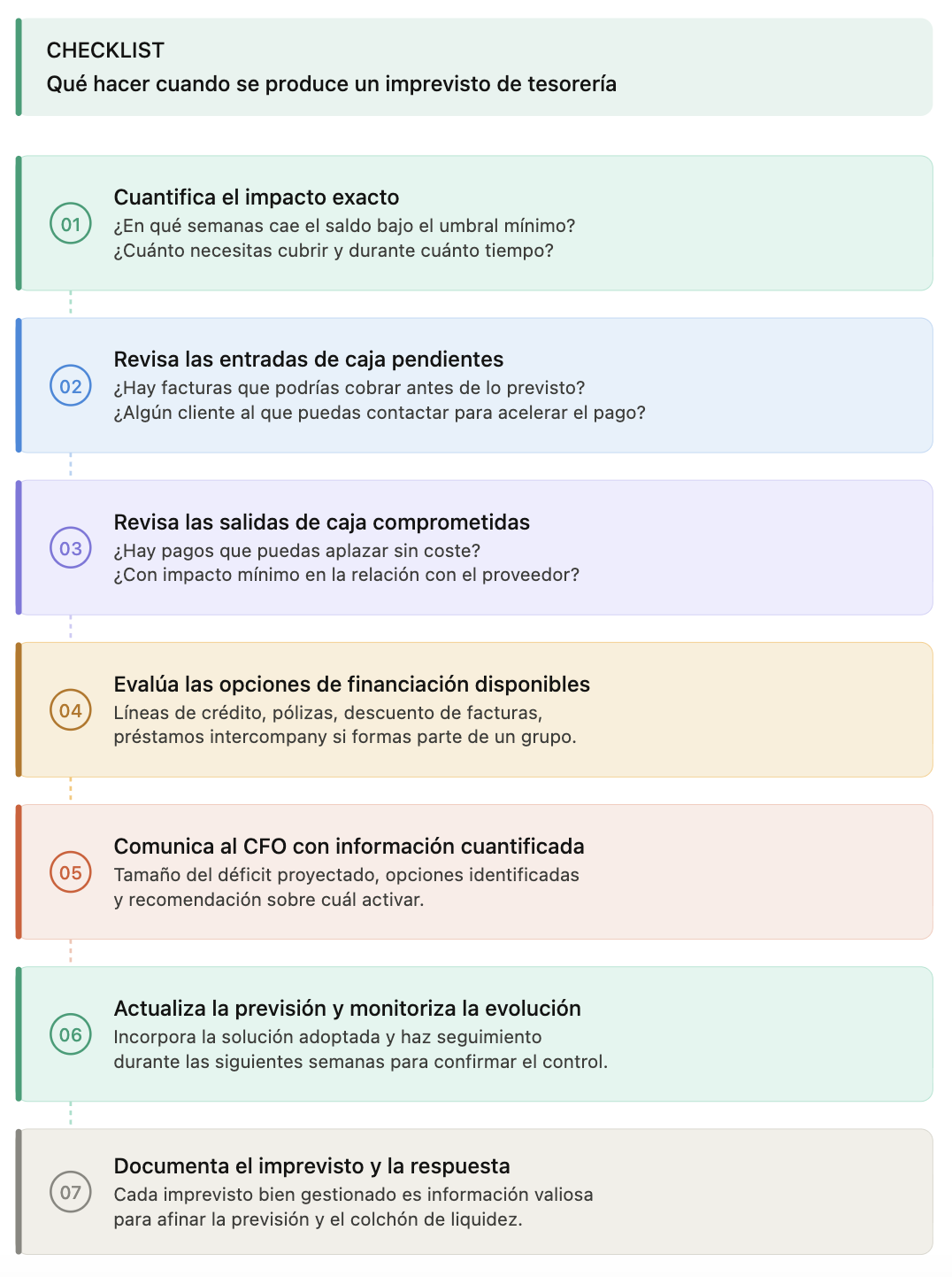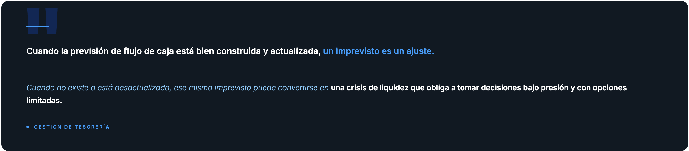 El objetivo de una buena gestión del flujo de caja no es reaccionar rápido cuando aparece el imprevisto, sino detectarlo con suficiente antelación para que la respuesta sea ordenada y con opciones. Una previsión a 13 semanas actualizada semanalmente convierte muchos 'imprevistos' en situaciones identificadas con 3-4 semanas de antelación. A esa distancia, las opciones disponibles son mucho más amplias y menos costosas.