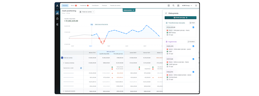 Visibilidad unificada y automatización: eliminar la consolidación manual estableciendo una visión 360° y en tiempo real de las 60 cuentas bancarias del grupo en sus nueve entidades, transformando un proceso manual de medio día en un reporting inmediato.