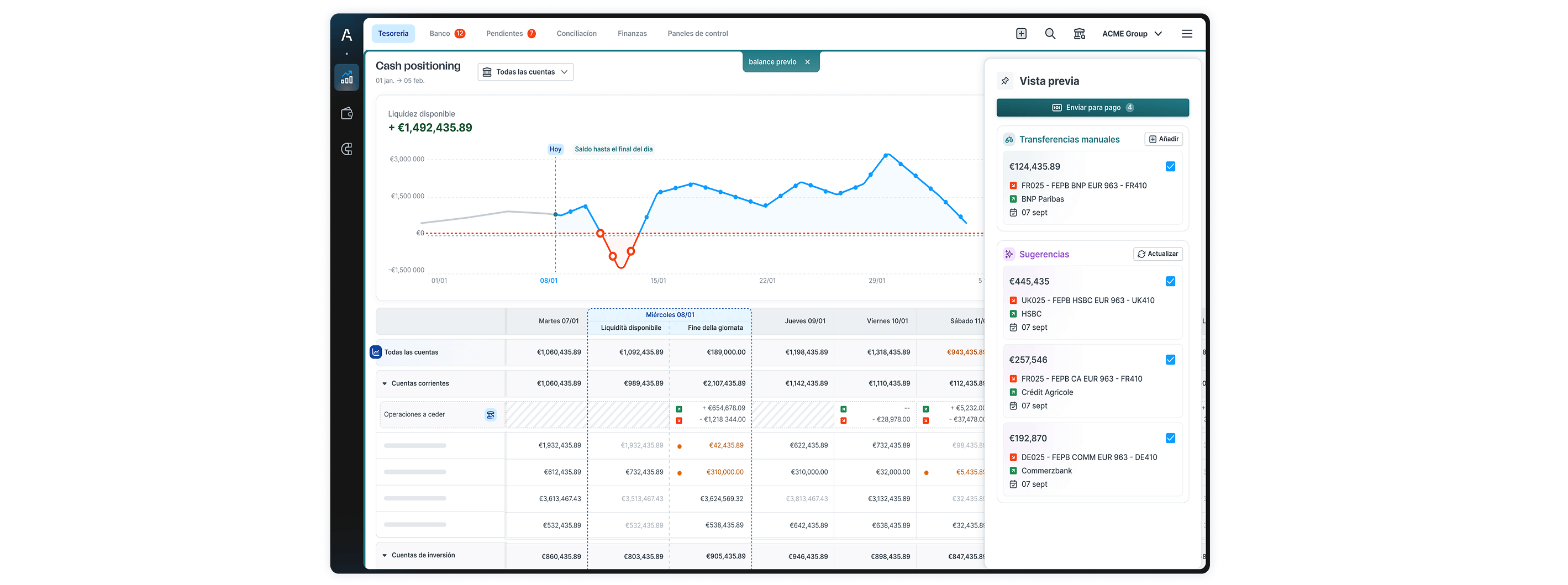 Conectividad y centralización: creación de un hub financiero unificado al conectar a todos los bancos mediante el protocolo EBICS TS. Esto permitió la consolidación en tiempo real y dashboards personalizados para las nueve entidades, con visibilidad inmediata a nivel de grupo.