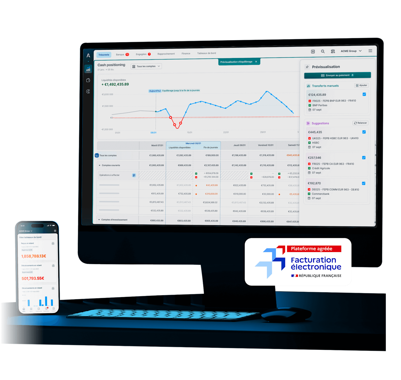 Centralisez, projetez et optimisez vos flux de trésorerie. Données enrichies par les statuts de cycle de vie de la facturation électronique.