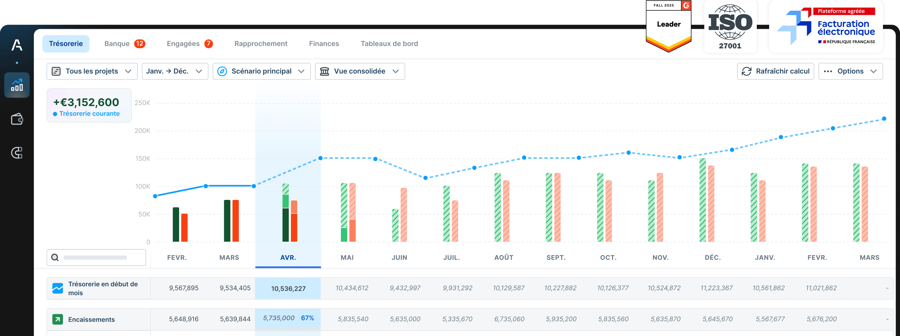 Toute votre trésorerie sur une seule plateforme : cash management, prévisionnel, facturation électronique, exécution des paiements, gestion des dépenses et recouvrement.