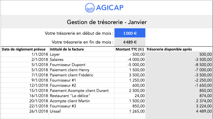Exemple de tableau de trésorerie :