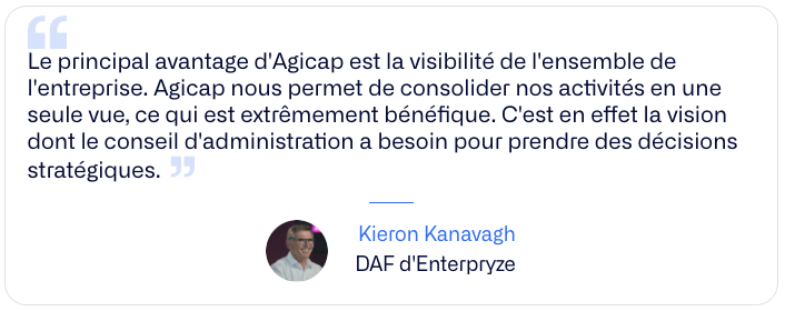 Enterpryze est un client d'Agicap basé en Irlande depuis 2022. L'entreprise utilise la connectivité bancaire pour améliorer la gestion des flux de trésorerie de son équipe financière. Enterpryze gère cinq entités au niveau mondial. Ces entités sont gérées dans Agicap pour pouvoir comparer les prévisions de trésorerie au niveau du groupe et des filiales.