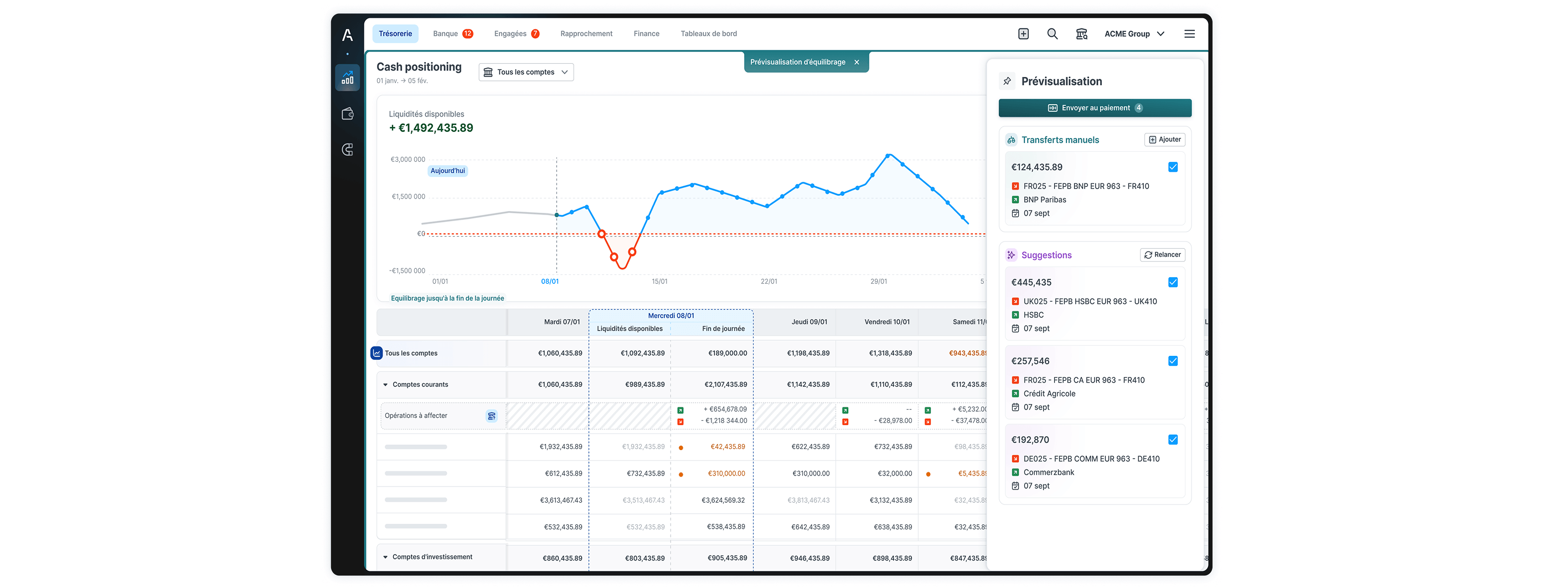 Connectivité et centralisation : connexion de l'ensemble des banques via le protocole EBICS TS et paramétrage de tableaux de bord personnalisés pour les 9 entités, permettant une vision consolidée immédiate.