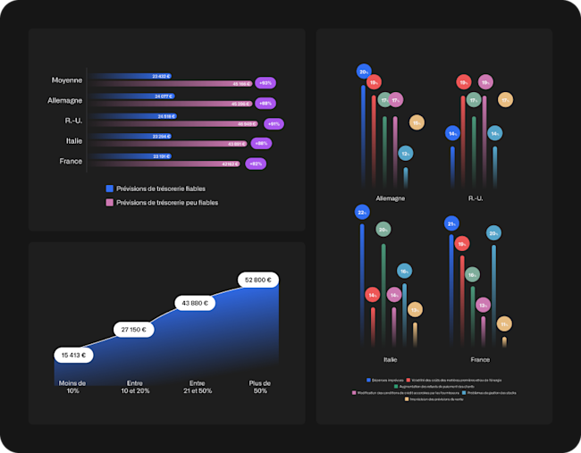 Le manque de fiabilité des prévisions de trésorerie a des conséquences financières directes. Des prévisions inexactes ou dépassées entraînent des frais de découvert, des opportunités d'investissement manquées et des décisions de financement sous-optimales. Les chiffres fournis par cette étude alimenteront vos réflexions en vous permettant de déterminer l'ampleur de chacun de ces défis.