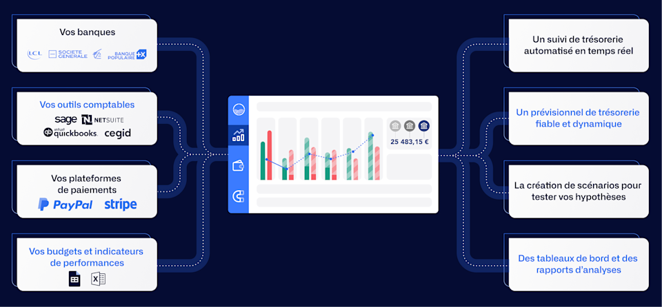 Surveillez et prévenez les creux de trésorerie potentiels en connectant votre solde actuel aux décaissements à venir