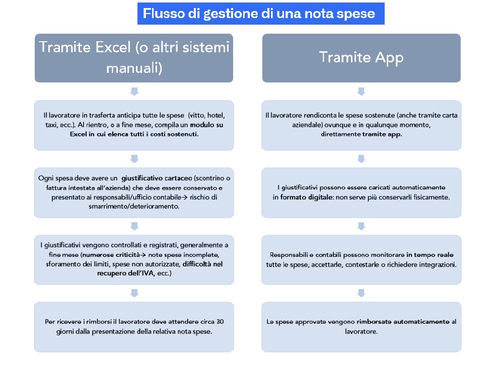 Vediamo, dunque, come cambia il flusso di gestione di una nota spese per un viaggio aziendale, se fatta tramite Excel oppure da app.