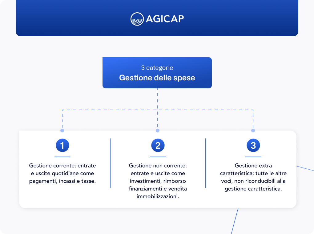 gestione non corrente, cioè tutte le uscite e entrate al di fuori della quotidianità. Rientrano in questa categoria investimenti, rimborso di finanziamenti, liquidazione di utili ed entrate per la vendita di immobilizzazioni;