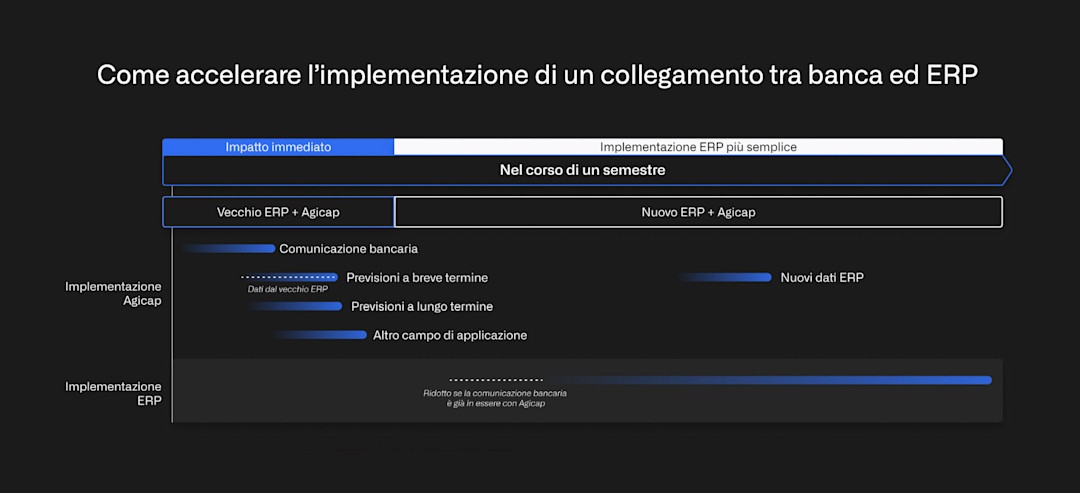 L'integrazione di una soluzione di connettività bancaria nei processi di gestione finanziaria dell'impresa può rendere l'implementazione di un nuovo sistema ERP molto più efficiente. Semplificando l'aspetto della connettività bancaria, questa soluzione consente all'azienda di concentrarsi su altri aspetti critici dell'implementazione ERP, contribuendo al successo complessivo del progetto e alla crescita del business.