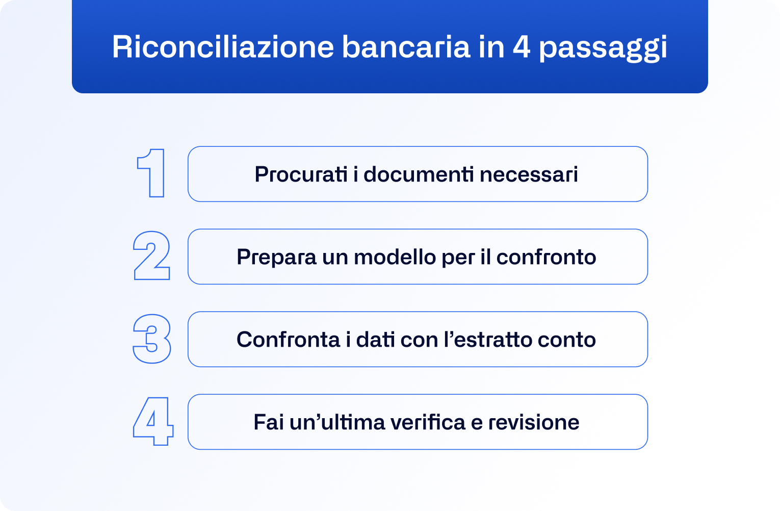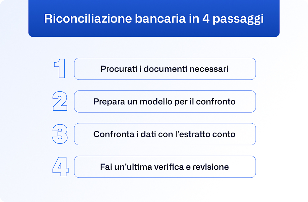 Per comprendere appieno l'importanza di questo processo, esaminiamo adesso i passaggi principali da seguire per effettuare una riconciliazione bancaria.