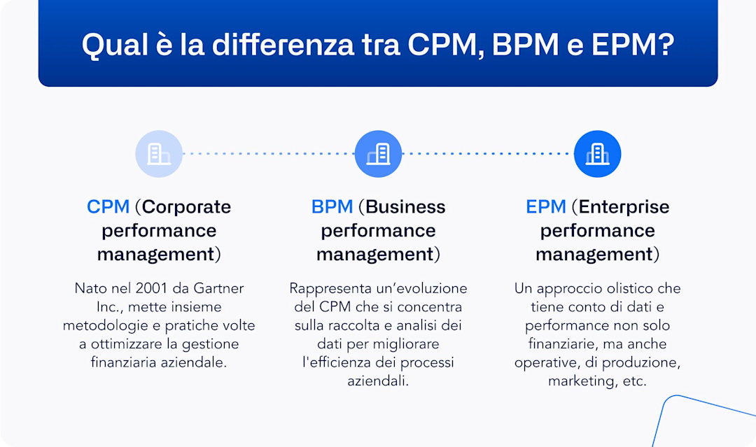 Il termine EPM, invece, fa riferimento all’evoluzione più recente di questa disciplina. L’Enterprise Performance Manangement, infatti, guarda alle performance dell’intera azienda. Non si ferma soltanto all’aspetto finanziario: copre invece più di una funzione aziendale, come la produzione, le vendite, il marketing, la catena di approvvigionamento, ecc.