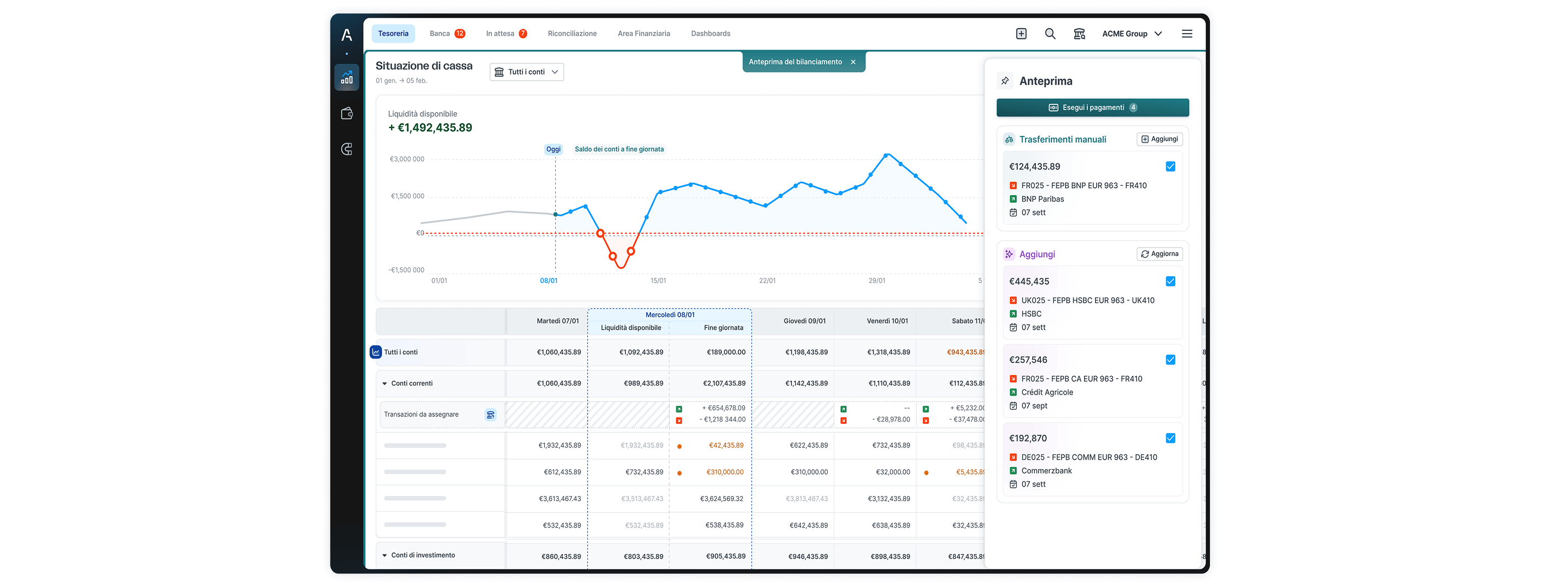 Connettività e centralizzazione: collegamento di tutte le banche tramite protocollo EBICS TS e configurazione di dashboard personalizzate per le 9 entità, per ottenere una visione consolidata immediata.