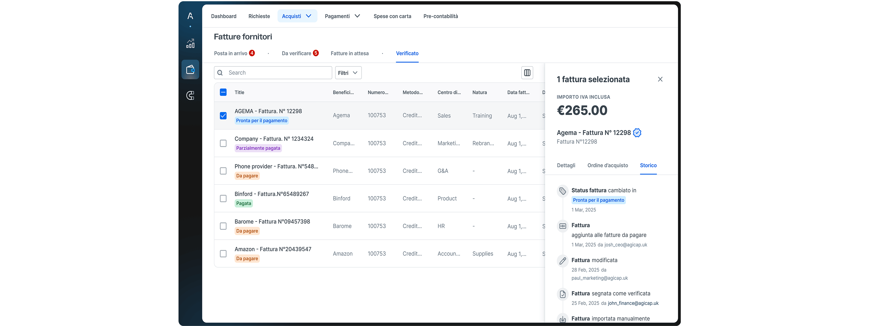 Maggiore sicurezza dei processi: workflow di approvazione sicuri — con segregazione dei compiti — insieme ad avvisi automatici in caso di modifica dell’IBAN hanno ridotto in modo significativo il rischio di frodi interne ed esterne.