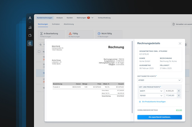 Importieren Sie Ihr Kontenrahmen, verknüpfen Sie Konten mit jeder Rechnung und exportieren Sie Ihre Buchungssätze mit nur einem Klick in Ihr ERP-System.